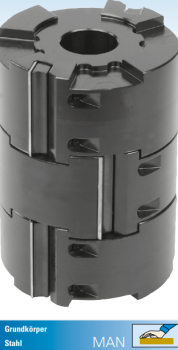 Ausführung: Mehrteilig, Grundkörper aus Stahl, Schnitthöhe durch Aufbau wählbar, verdrehsicher, spandickenbegrenzt, ausgerüstet mit HW-Wendeplatten Messern.